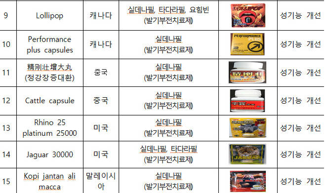 주로 실데나필, 타다라필, 요힘빈 같이 의약품으로 지정돼 있는 발기부전 치료제 성분이 함유된 제품들입니다.
